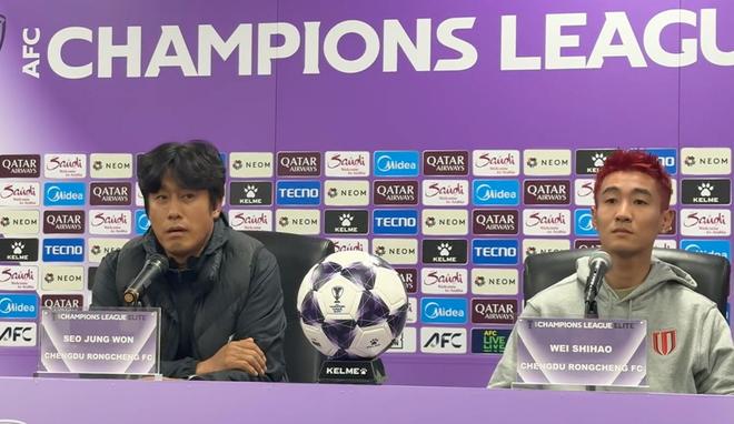 12月8日,成都蓉城的亚冠赛前新闻发布会,主教练徐正源和球员韦世豪出席。